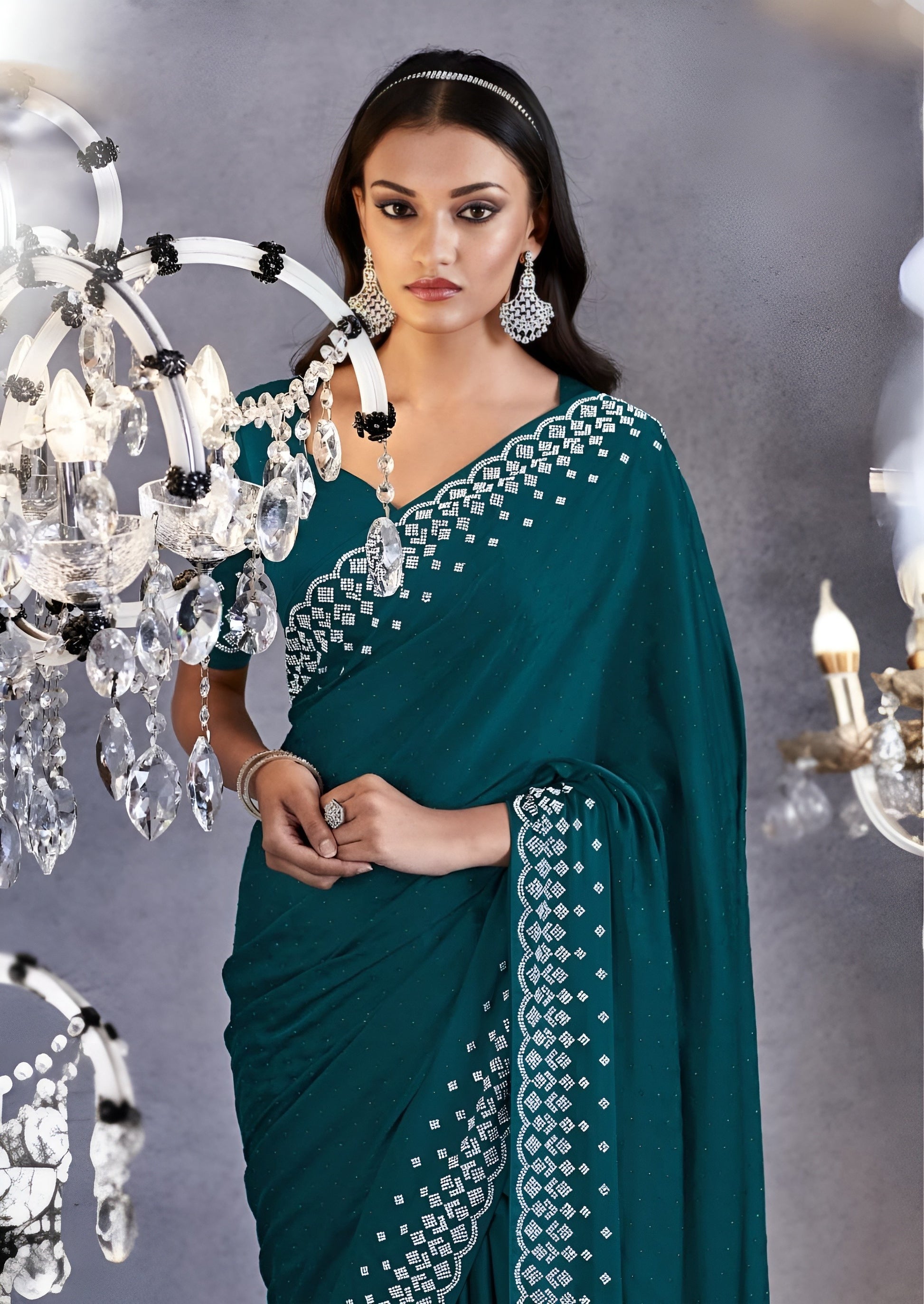 EKKTARA Saree For Women Forest Green Colour Partywear Satin Silk Zarkan Work Saree With Unstitched Blouse