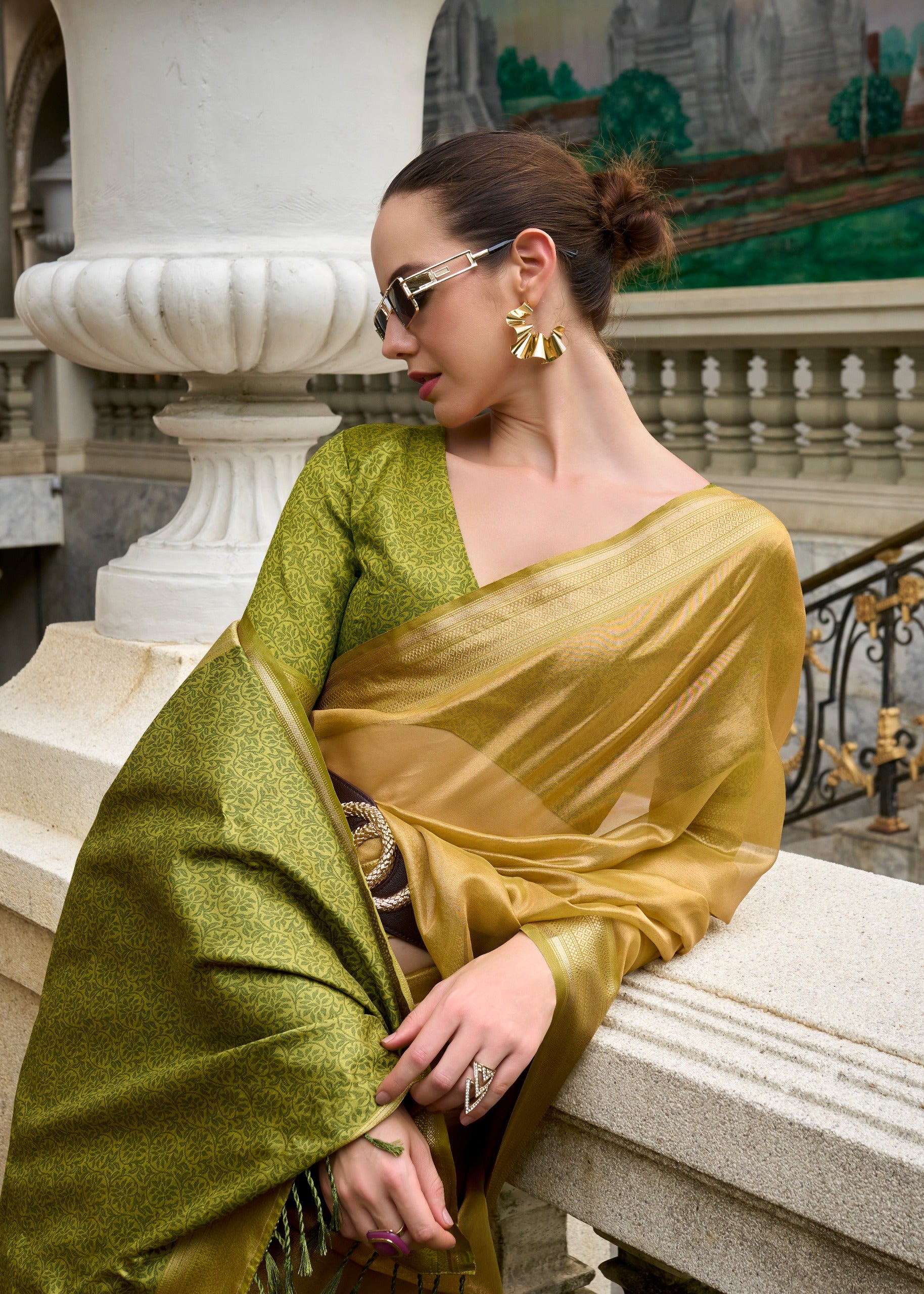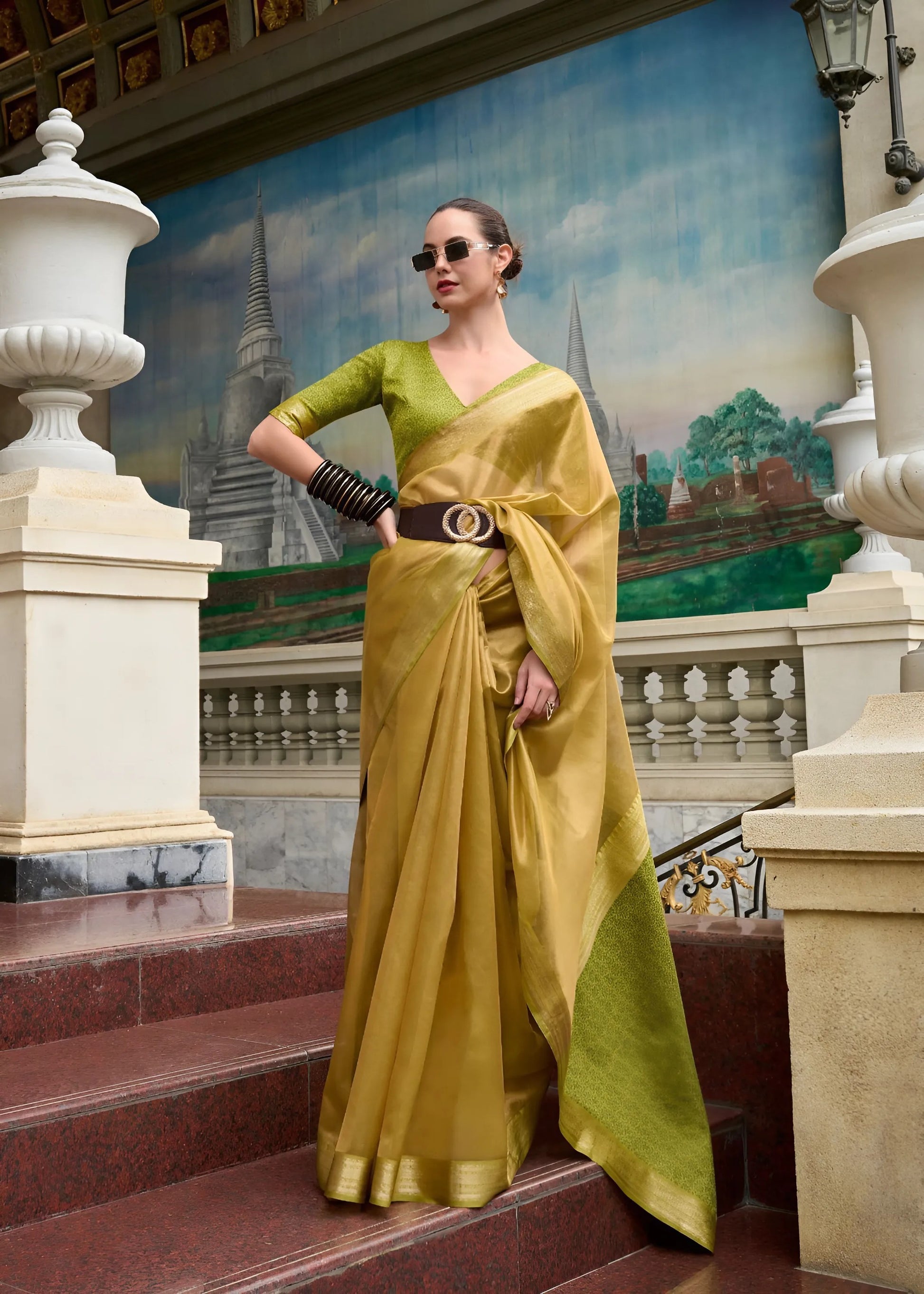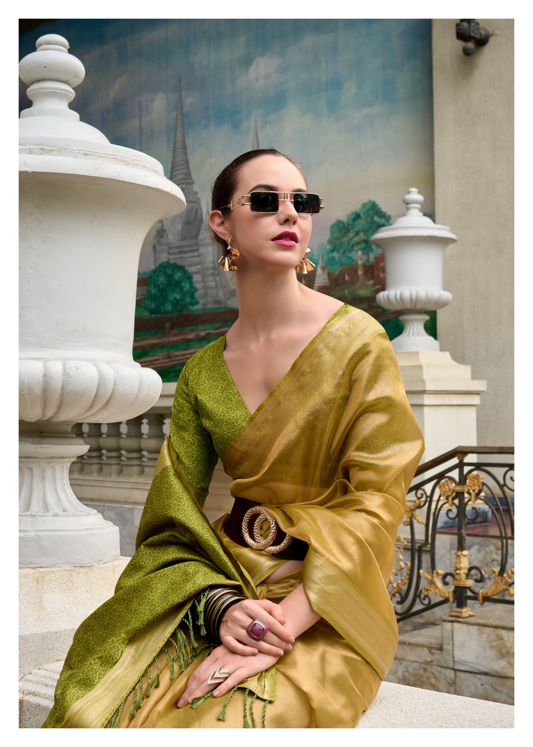 EKKTARA Saree For Women Golden Green Colour Pure Tissue Saree With Designer Pallu And Unstitched Blouse