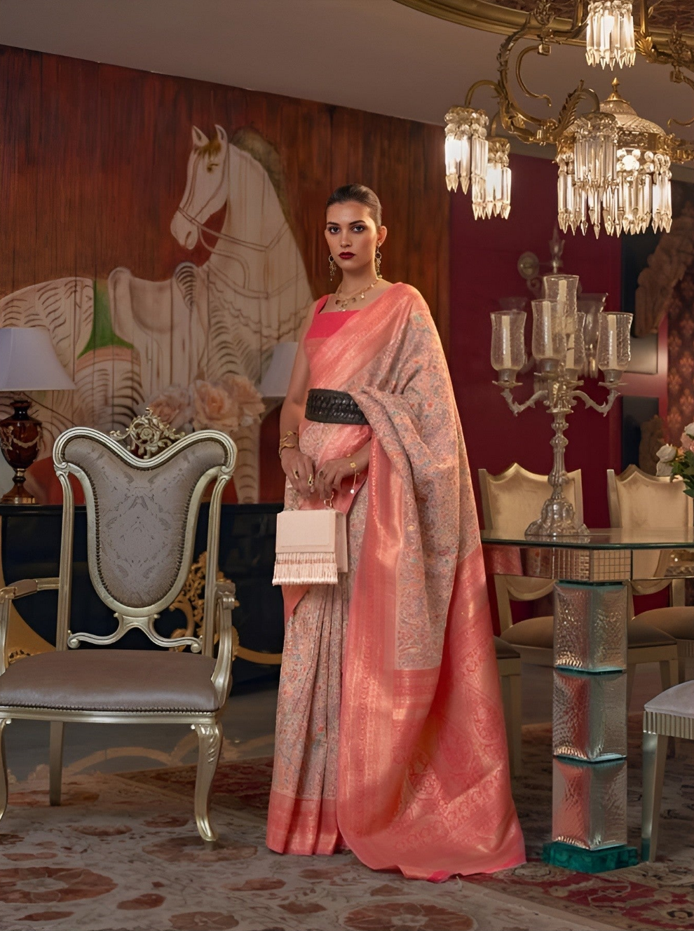 EKKTARA Saree For Women Peach Colour Kashmiri Chaap Handloom Weaving Silk Saree With Unstitched Blouse