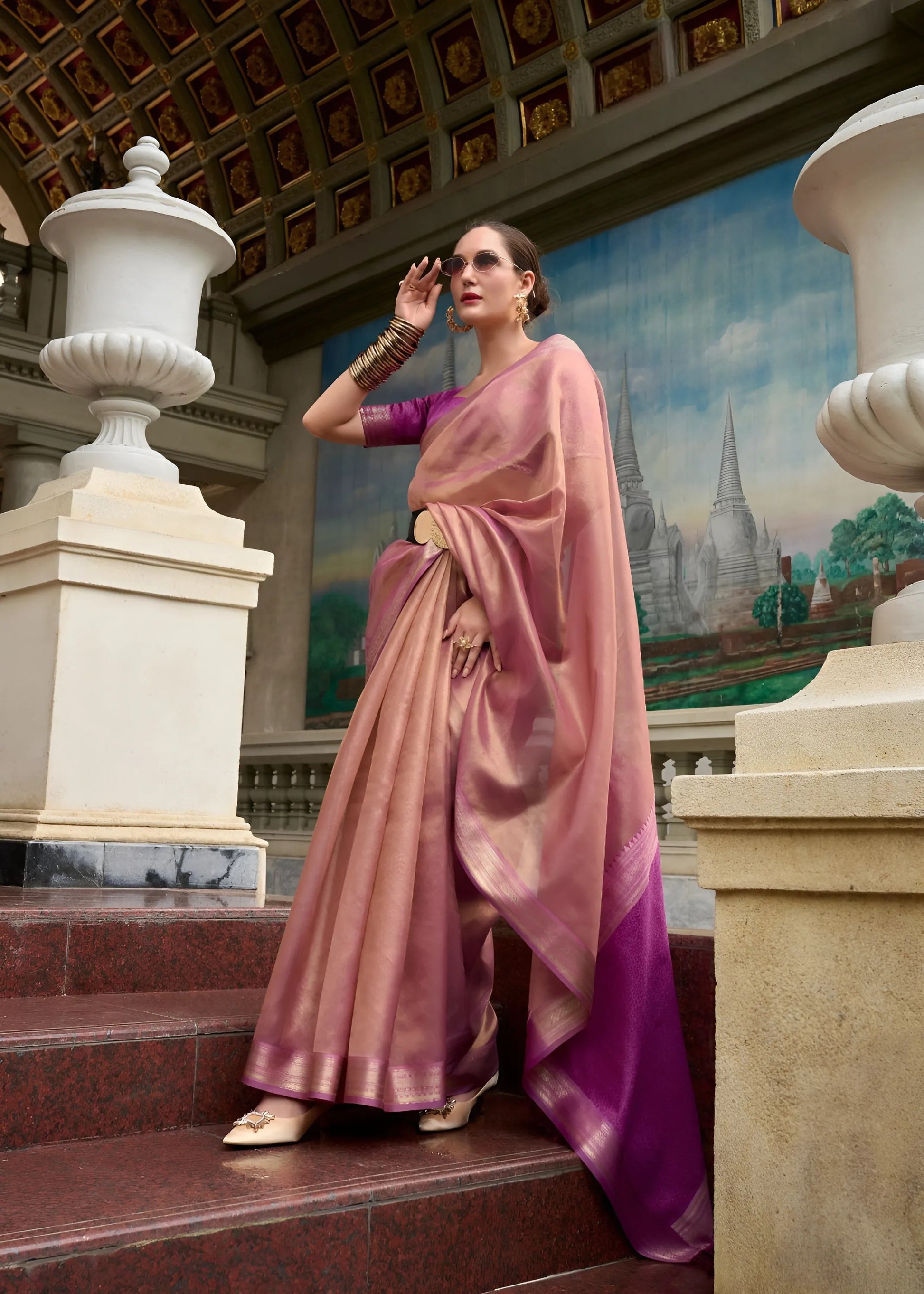 EKKTARA Saree For Women Copper Pink Colour Pure Tissue Saree With Designer Pallu And Unstitched Blouse