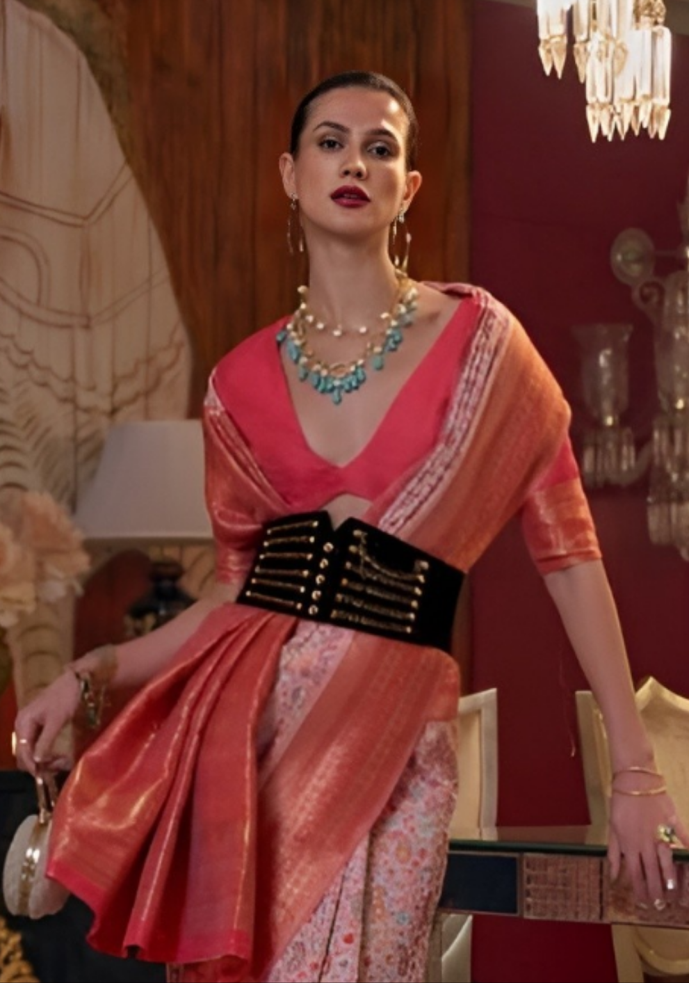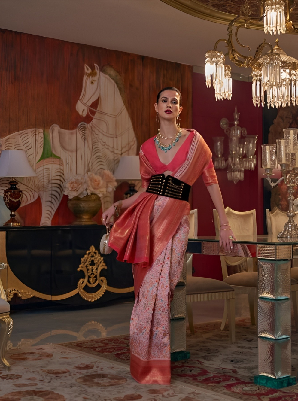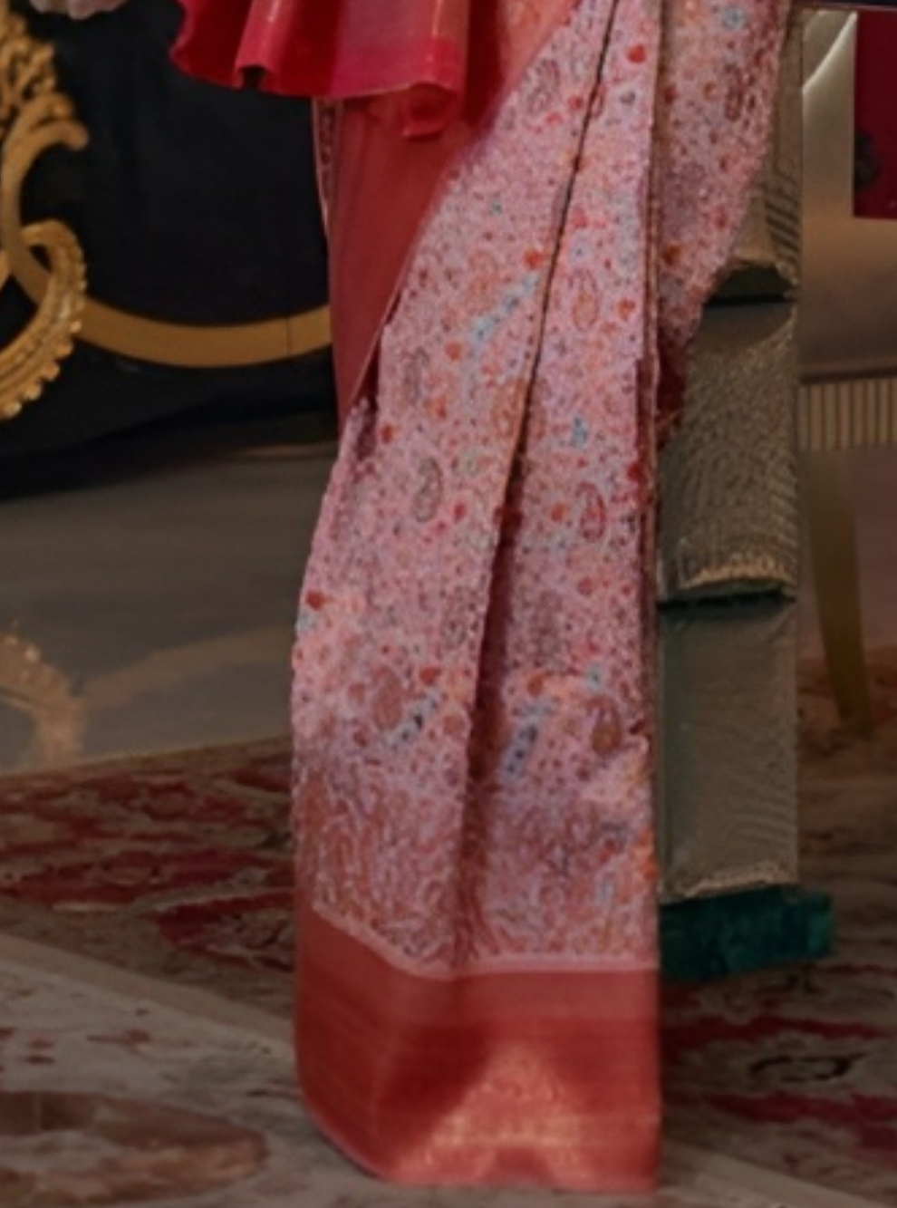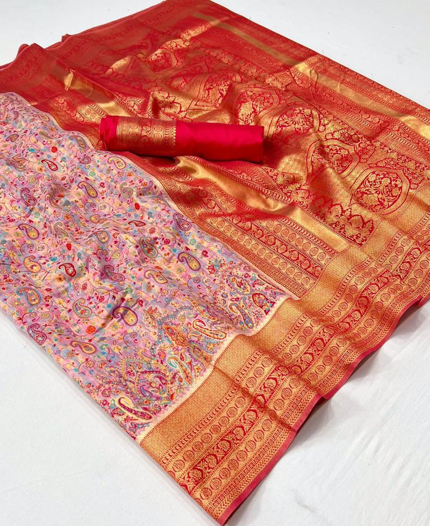 EKKTARA Saree For Women Light Pink Colour Kashmiri Chaap Handloom Weaving Silk Saree With Unstitched Blouse