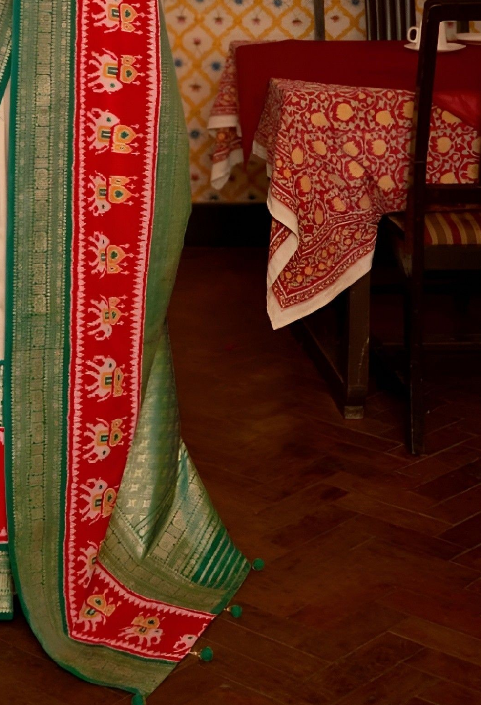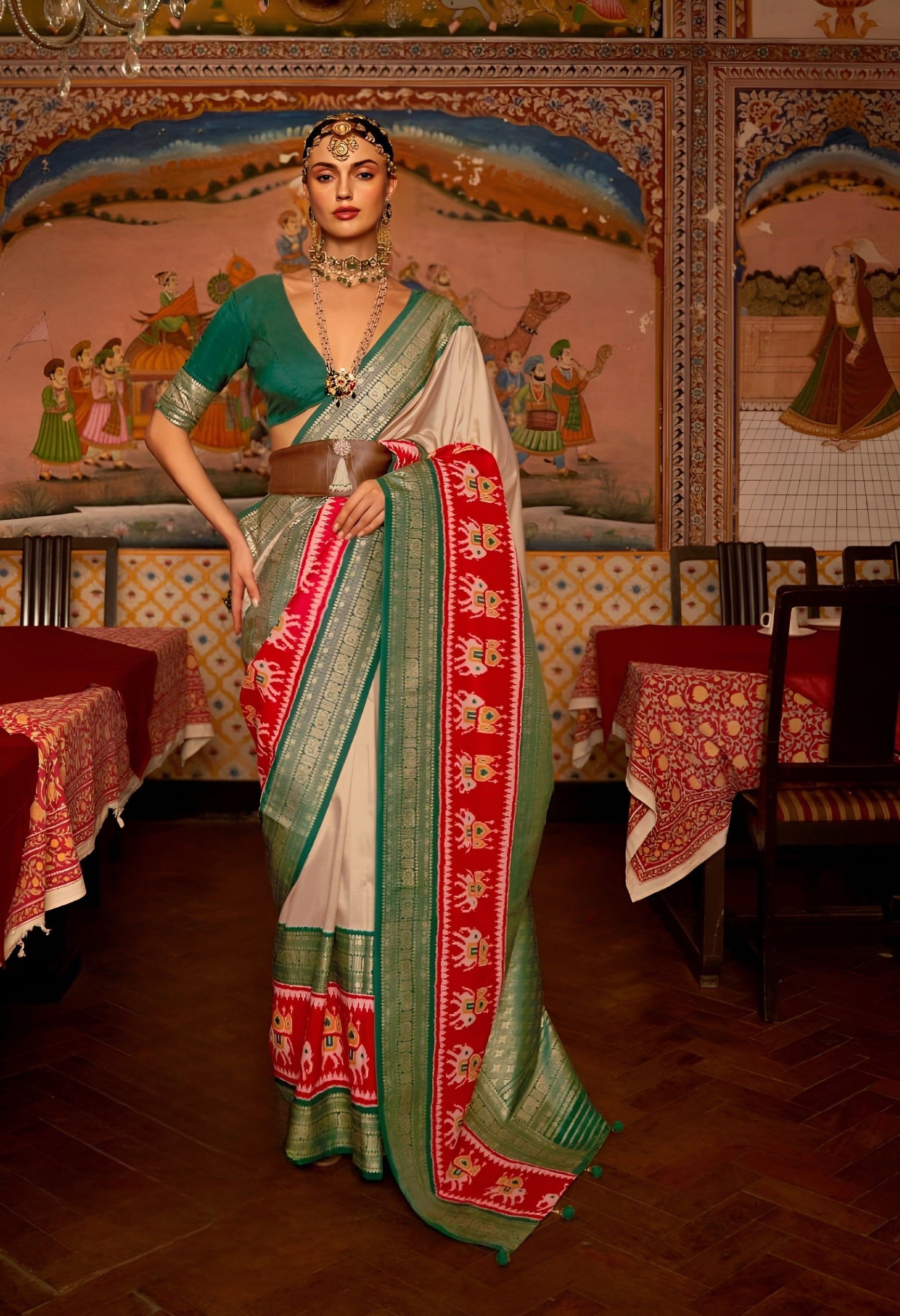 EKKTARA Saree For Women Pista Cream Colour Pure Silk Designer Patola Saree With Unstitched Blouse