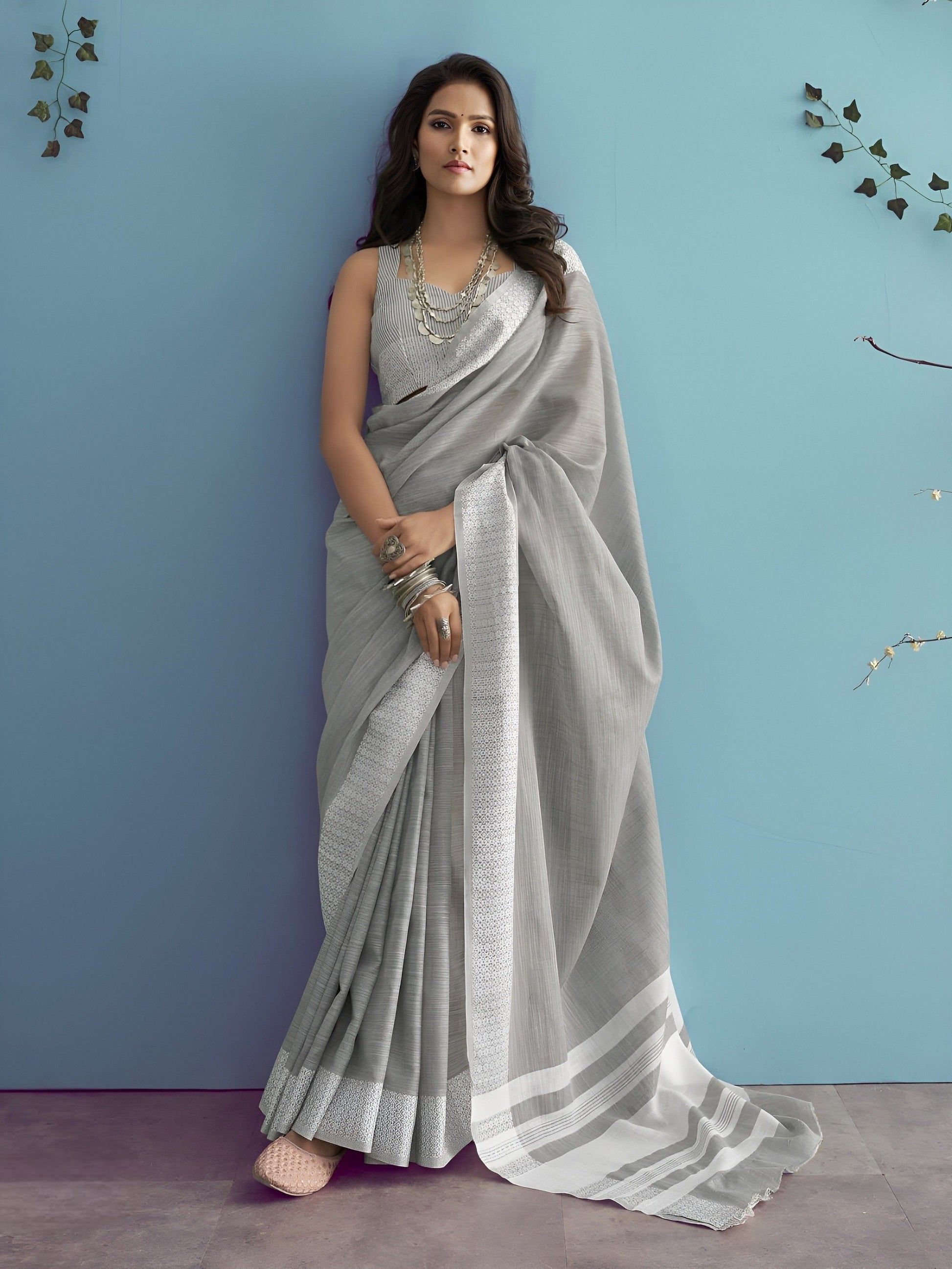 EKKTARA Saree For Women Perl Grey Linen Silk Chikankari Border Weaving Saree