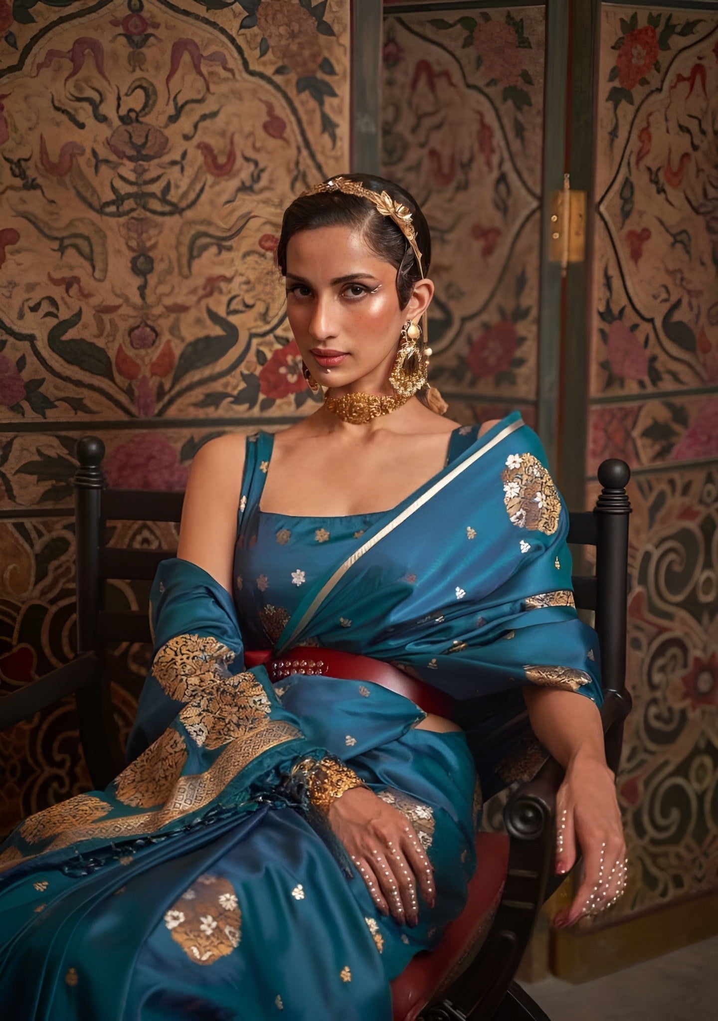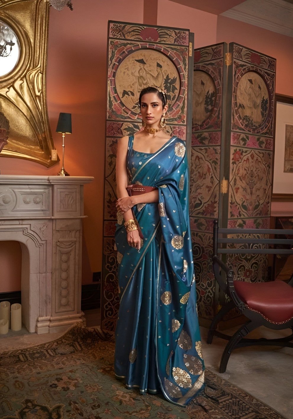 EKKTARA Saree For Women Sapphire Blue Satin Silk Zari Weaving Saree