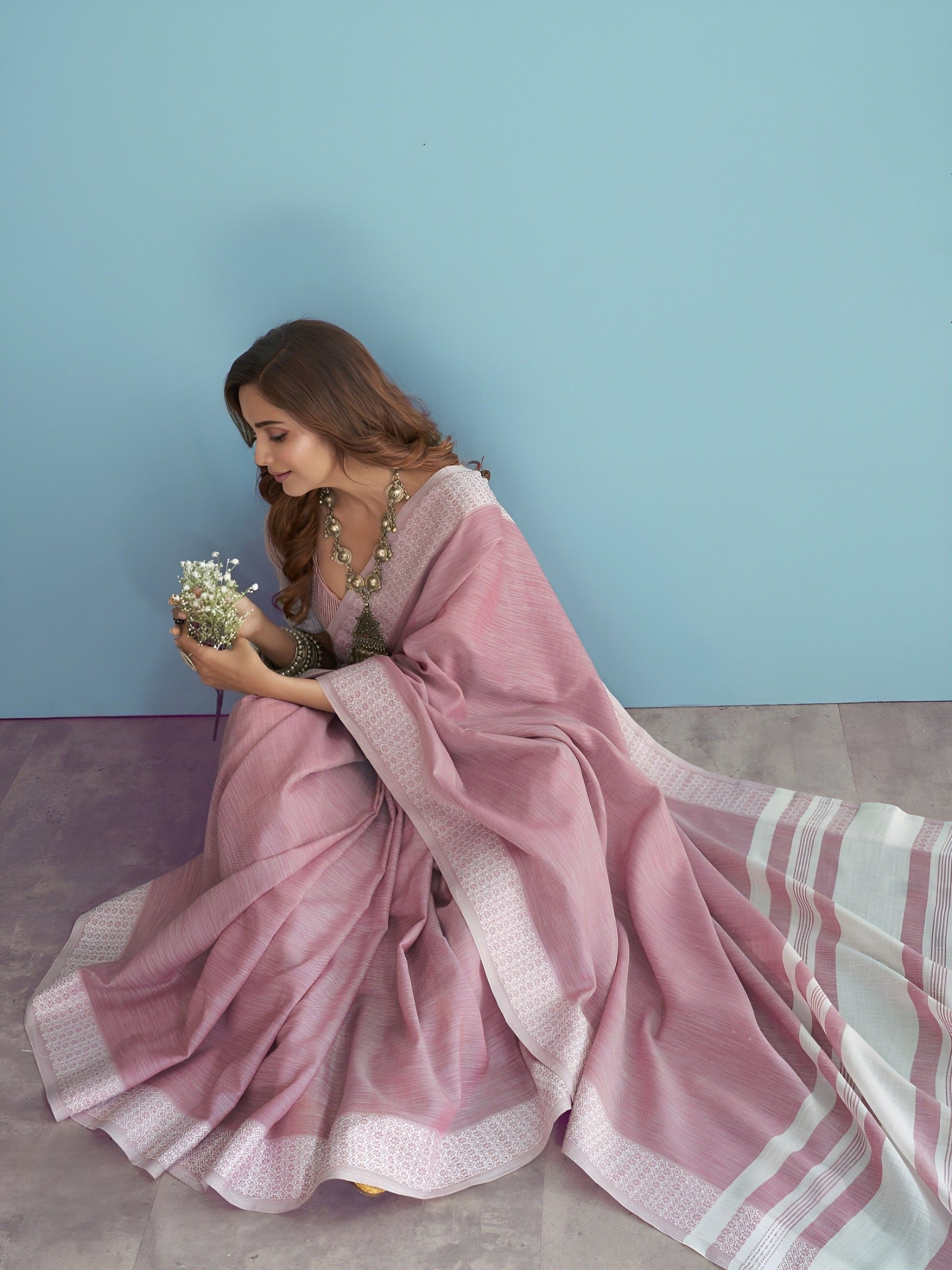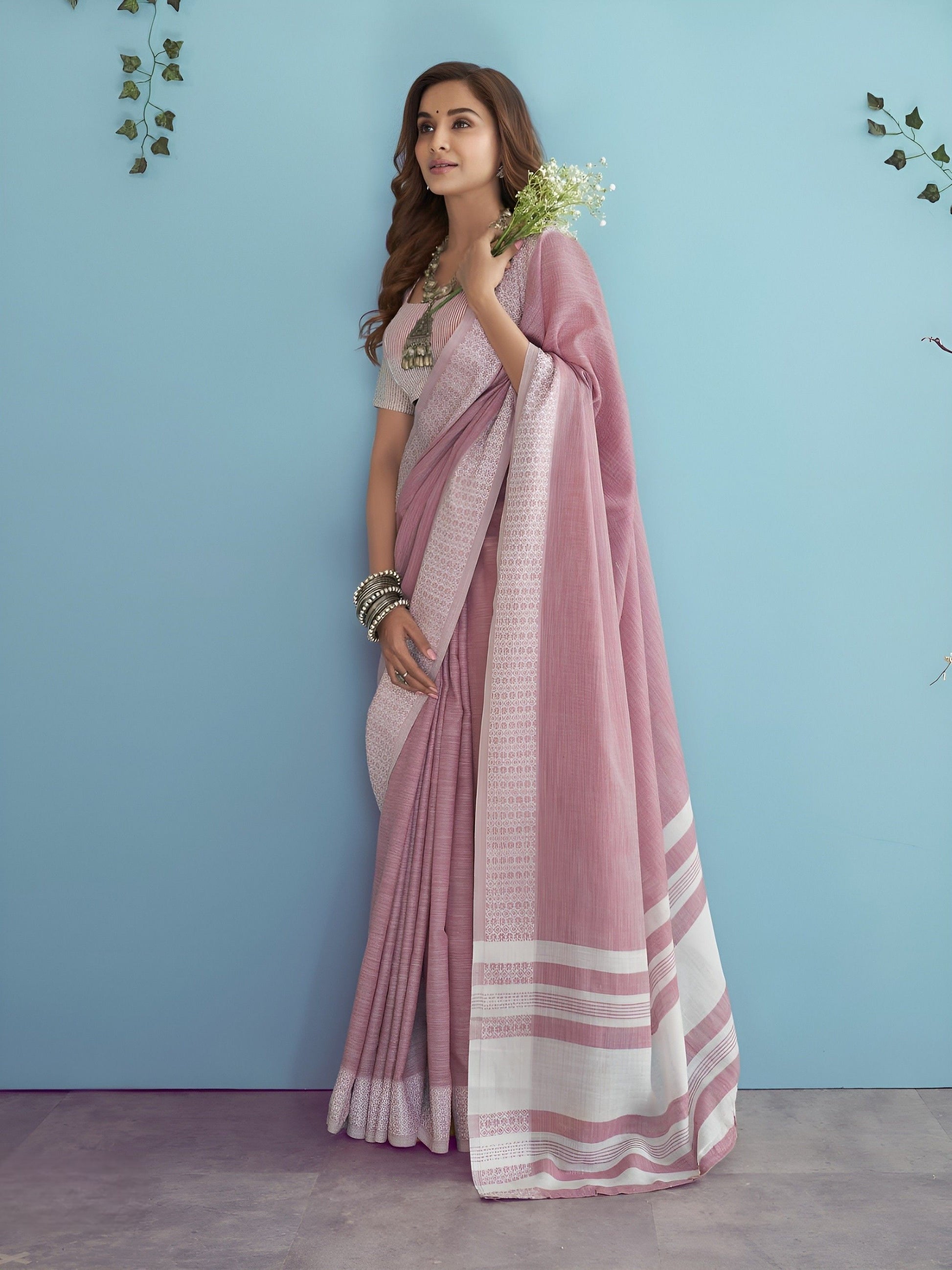 EKKTARA Saree For Women Carnation Pink Linen Silk Chikankari Border Weaving Saree