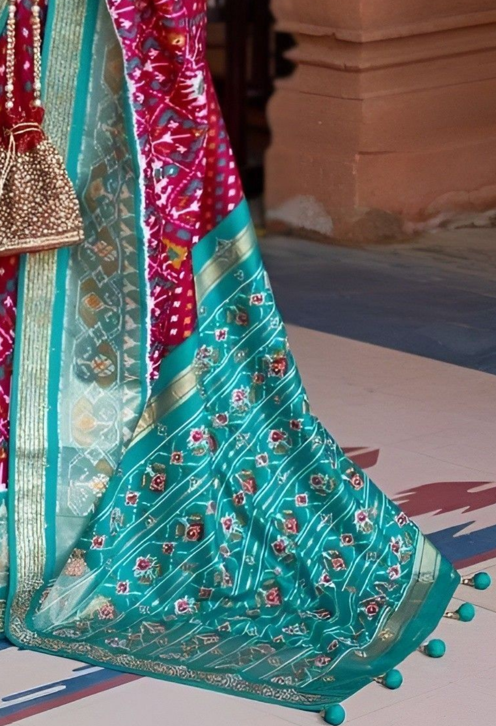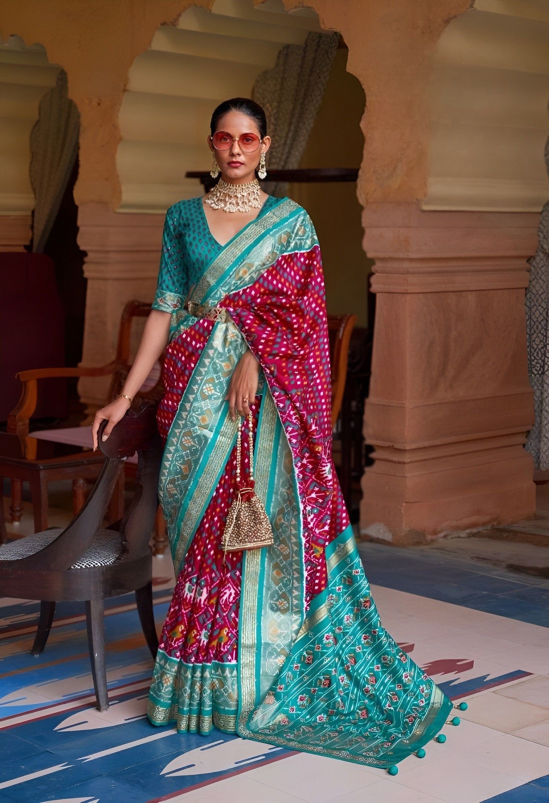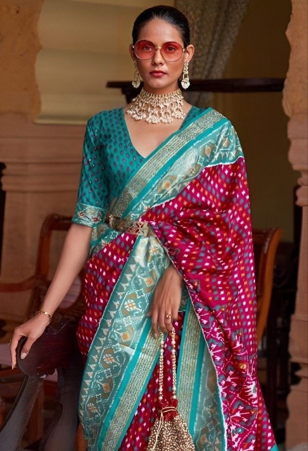 EKKTARA Saree For Women Pink Colour Soft Silk Printed Patola Saree With Unstitched Blouse