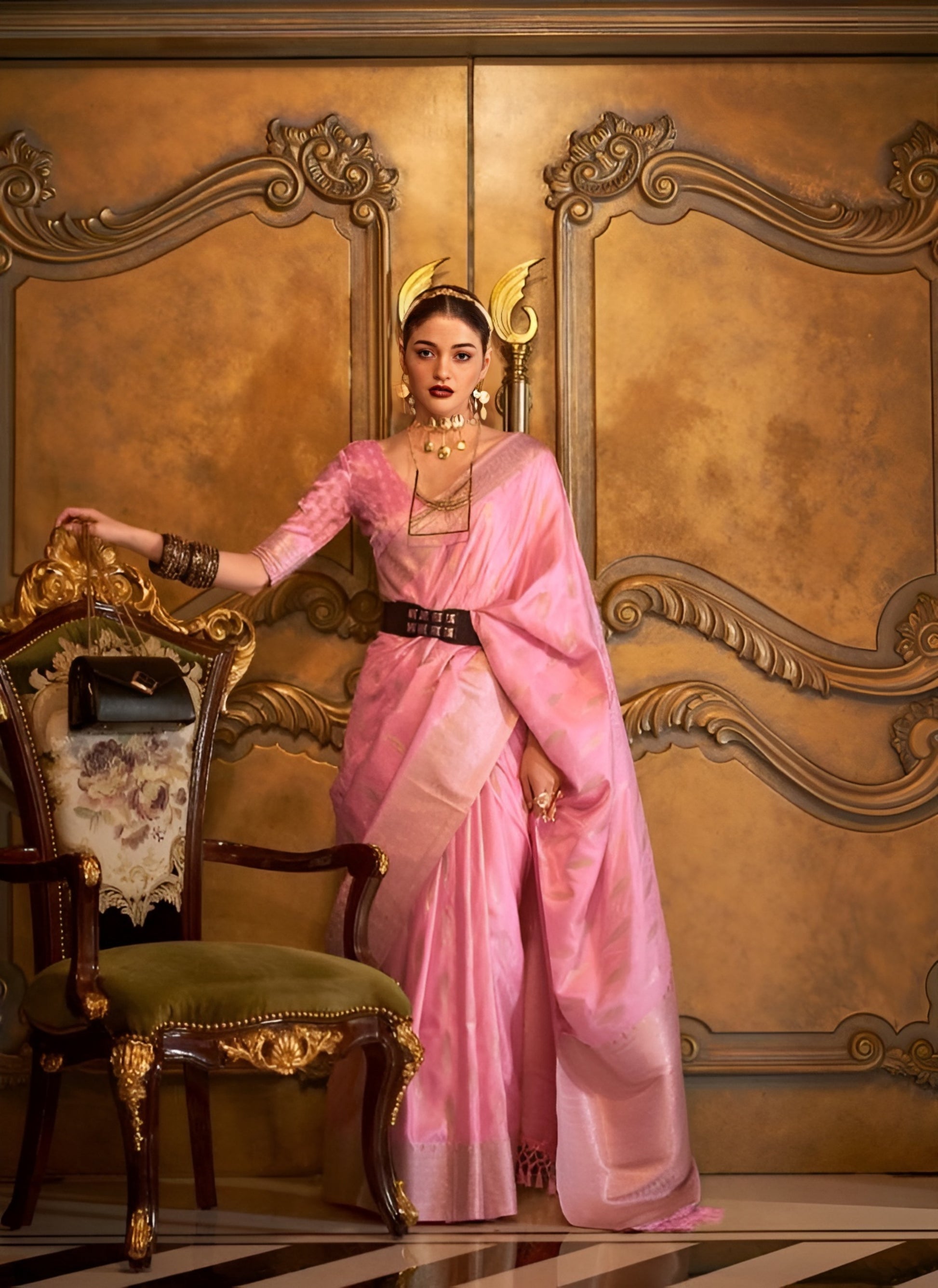 EKKTARA Saree For Women Blush Pink Silk Satin Handloom Weaving Saree