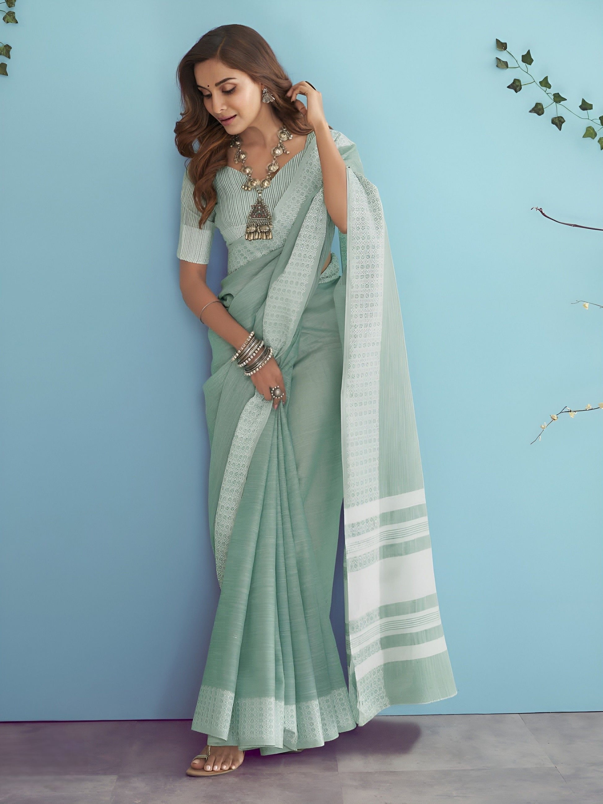EKKTARA Saree For Women Tea Green Linen Silk Chikankari Border Weaving Saree
