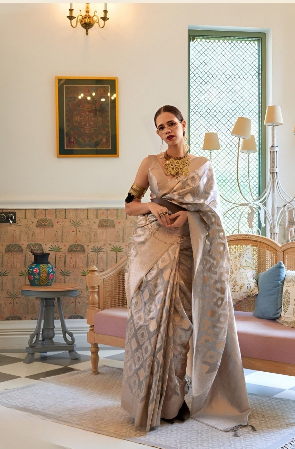 EKKTARA Saree For Women Beige Colour Tissue Zari Handloom Weaving Saree Celebrity Collection