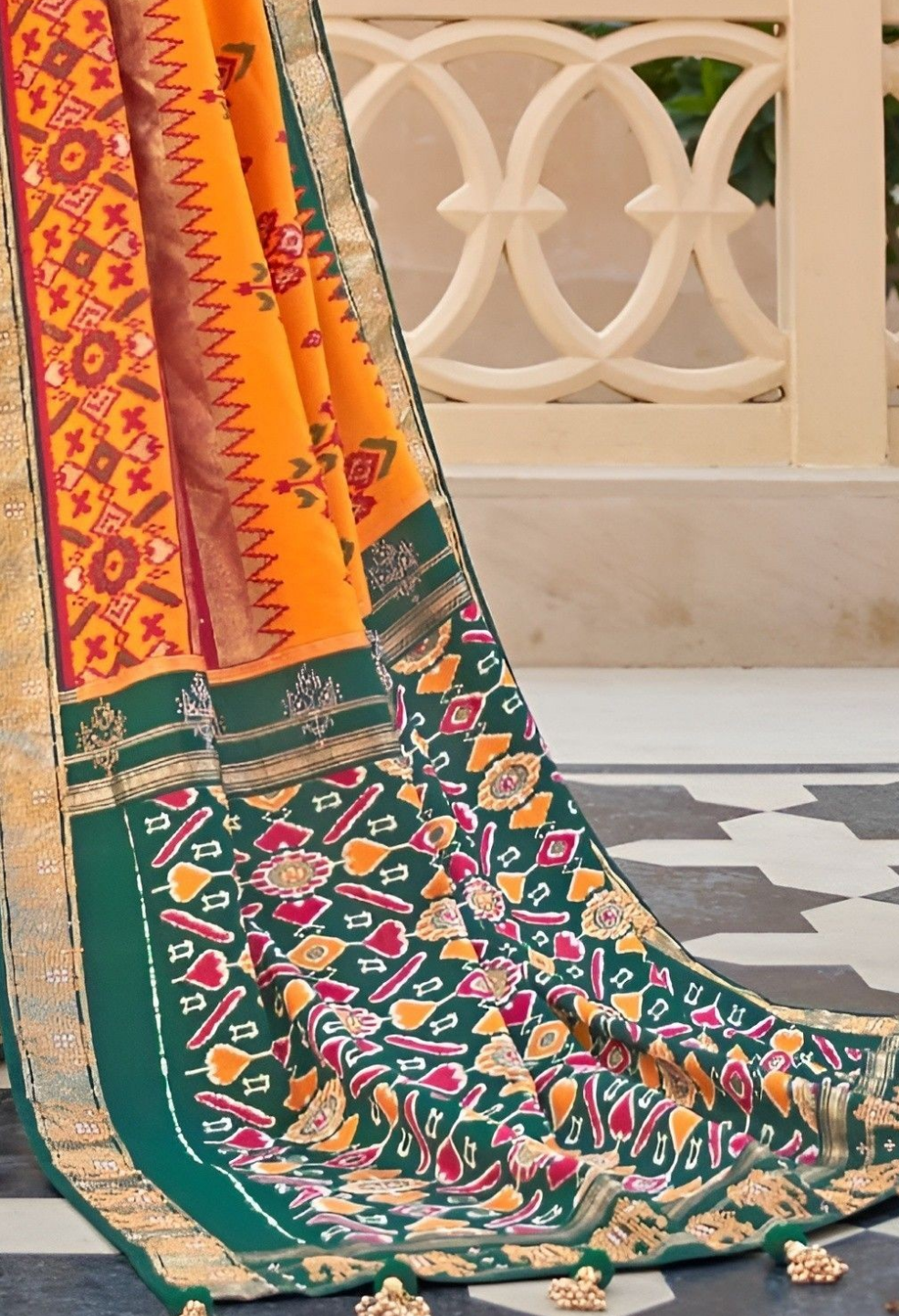 EKKTARA Saree For Women Chrome Yellow Colour Pure Silk Trendy Patola Saree With Unstitched Blouse